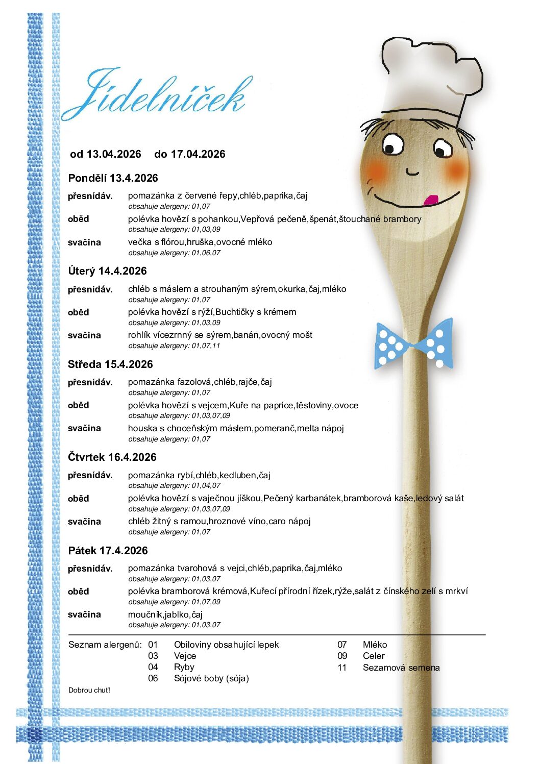 Vyzvedávání obědů je možné od 10:00 - 11:30 hodin, ale pouze první den nepřítomnosti
